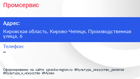 Промсервис по адресу Кировская область, Кирово-Чепецк, Производственная улица, 6 в дальнейшем Организация, размещена в следующих категориях:
