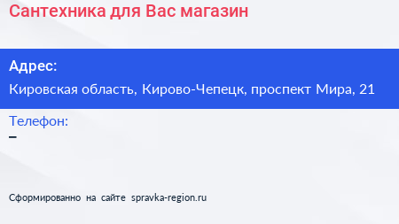 Сантехника для Вас, магазин по адресу Кировская область, Кирово-Чепецк, проспект Мира, 21 в дальнейшем Организация, размещена в следующих категориях: