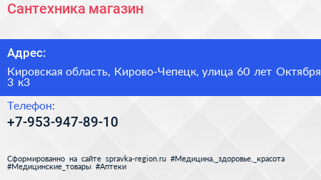 Сантехника, магазин по адресу Кировская область, Кирово-Чепецк, улица 60 лет Октября, 3 к3 в дальнейшем Организация, размещена в следующих категориях: