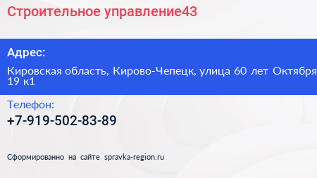 Строительное управление43 по адресу Кировская область, Кирово-Чепецк, улица 60 лет Октября, 19 к1 в дальнейшем Организация, размещена в следующих категориях: