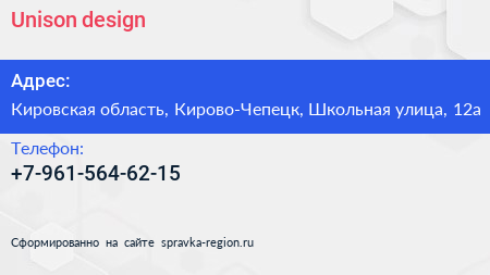 Unison-design по адресу Кировская область, Кирово-Чепецк, Школьная улица, 12а в дальнейшем Организация, размещена в следующих категориях:
