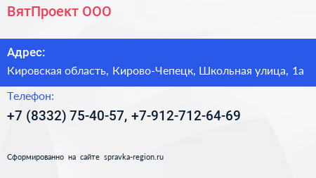 ВятПроект, ООО по адресу Кировская область, Кирово-Чепецк, Школьная улица, 1а в дальнейшем Организация, размещена в следующих категориях: