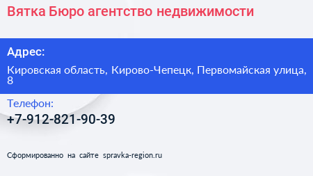 Вятка-Бюро, агентство недвижимости по адресу Кировская область, Кирово-Чепецк, Первомайская улица, 8 в дальнейшем Организация, размещена в следующих категориях: