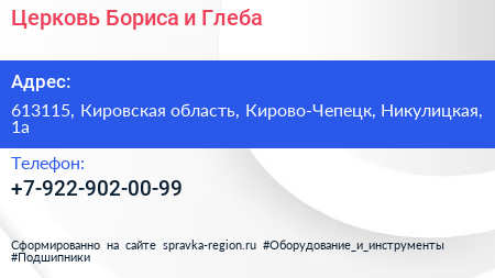 Церковь Бориса и Глеба по адресу 613115, Кировская область, Кирово-Чепецк, Никулицкая, 1а в дальнейшем Организация, размещена в следующих категориях: