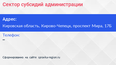 Сектор субсидий администрации по адресу Кировская область, Кирово-Чепецк, проспект Мира, 17Б в дальнейшем Организация, размещена в следующих категориях:
