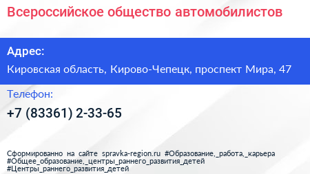 Всероссийское общество автомобилистов по адресу Кировская область, Кирово-Чепецк, проспект Мира, 47 в дальнейшем Организация, размещена в следующих категориях: