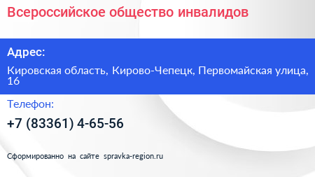 Всероссийское общество инвалидов по адресу Кировская область, Кирово-Чепецк, Первомайская улица, 16 в дальнейшем Организация, размещена в следующих категориях:
