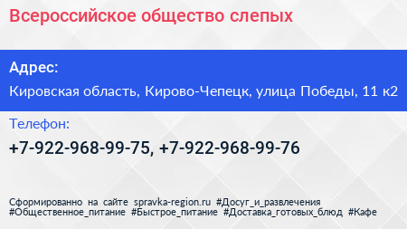 Всероссийское общество слепых по адресу Кировская область, Кирово-Чепецк, улица Победы, 11 к2 в дальнейшем Организация, размещена в следующих категориях: