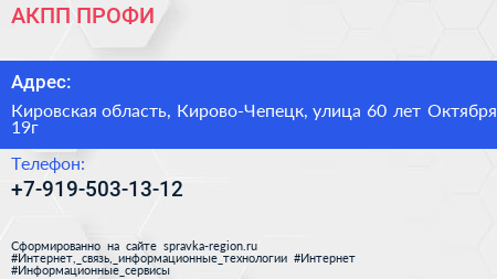АКПП ПРОФИ по адресу Кировская область, Кирово-Чепецк, улица 60 лет Октября, 19г в дальнейшем Организация, размещена в следующих категориях: