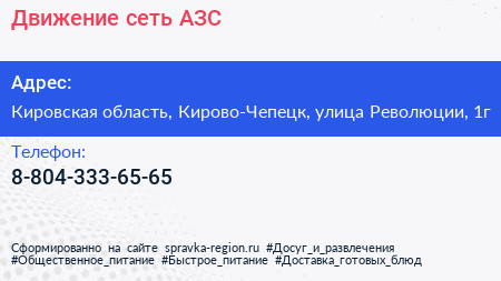 Движение, сеть АЗС по адресу Кировская область, Кирово-Чепецк, улица Революции, 1г в дальнейшем Организация, размещена в следующих категориях: