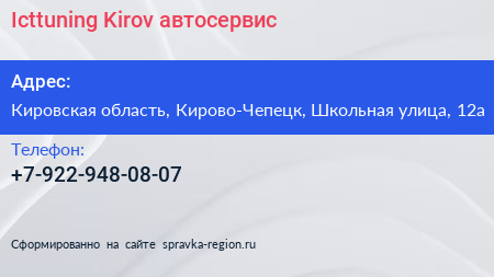 Icttuning Kirov, автосервис по адресу Кировская область, Кирово-Чепецк, Школьная улица, 12а в дальнейшем Организация, размещена в следующих категориях: