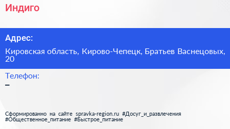 Индиго по адресу Кировская область, Кирово-Чепецк, Братьев Васнецовых, 20 в дальнейшем Организация, размещена в следующих категориях: