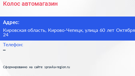 Колос, автомагазин по адресу Кировская область, Кирово-Чепецк, улица 60 лет Октября, 24 в дальнейшем Организация, размещена в следующих категориях: