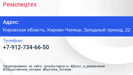Ремспецтех по адресу Кировская область, Кирово-Чепецк, Западный проезд, 22 в дальнейшем Организация, размещена в следующих категориях: