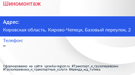 Шиномонтаж по адресу Кировская область, Кирово-Чепецк, Базовый переулок, 2 в дальнейшем Организация, размещена в следующих категориях: