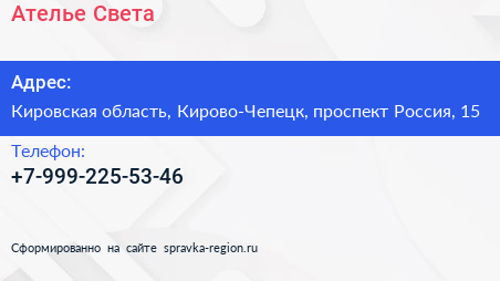 Ателье Света по адресу Кировская область, Кирово-Чепецк, проспект Россия, 15 в дальнейшем Организация, размещена в следующих категориях: