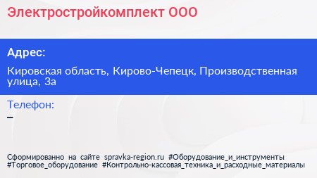 Электростройкомплект, ООО по адресу Кировская область, Кирово-Чепецк, Производственная улица, 3а в дальнейшем Организация, размещена в следующих категориях: