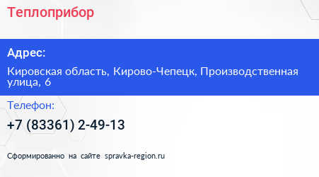 Теплоприбор по адресу Кировская область, Кирово-Чепецк, Производственная улица, 6 в дальнейшем Организация, размещена в следующих категориях: