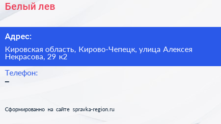 Белый лев по адресу Кировская область, Кирово-Чепецк, улица Алексея Некрасова, 29 к2 в дальнейшем Организация, размещена в следующих категориях: