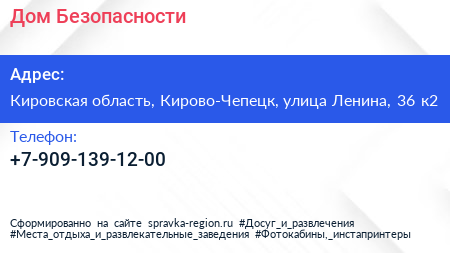 Дом Безопасности по адресу Кировская область, Кирово-Чепецк, улица Ленина, 36 к2 в дальнейшем Организация, размещена в следующих категориях: