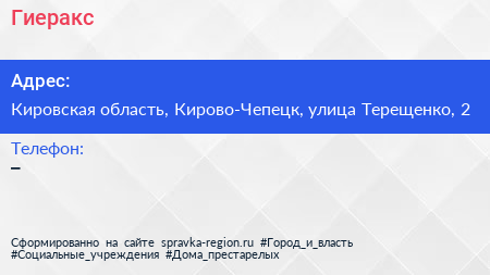 Гиеракс по адресу Кировская область, Кирово-Чепецк, улица Терещенко, 2 в дальнейшем Организация, размещена в следующих категориях: