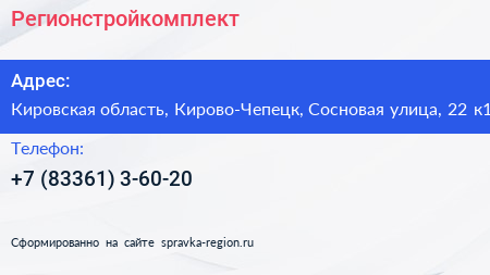 Регионстройкомплект по адресу Кировская область, Кирово-Чепецк, Сосновая улица, 22 к1 в дальнейшем Организация, размещена в следующих категориях: