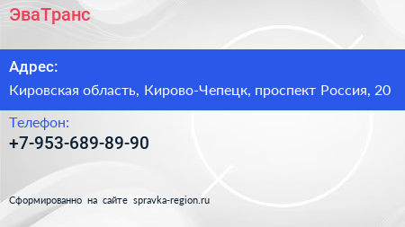 ЭваТранс по адресу Кировская область, Кирово-Чепецк, проспект Россия, 20 в дальнейшем Организация, размещена в следующих категориях: