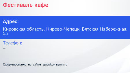 Фестиваль, кафе по адресу Кировская область, Кирово-Чепецк, Вятская Набережная, 5а в дальнейшем Организация, размещена в следующих категориях: