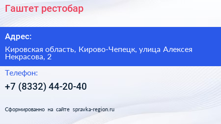 Гаштет, рестобар по адресу Кировская область, Кирово-Чепецк, улица Алексея Некрасова, 2 в дальнейшем Организация, размещена в следующих категориях:
