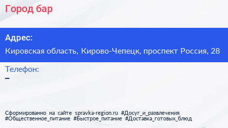 Город, бар по адресу Кировская область, Кирово-Чепецк, проспект Россия, 28 в дальнейшем Организация, размещена в следующих категориях: