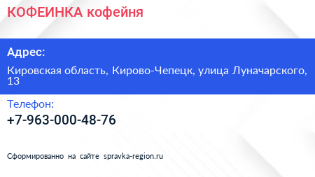 КОФЕИНКА, кофейня по адресу Кировская область, Кирово-Чепецк, улица Луначарского, 13 в дальнейшем Организация, размещена в следующих категориях: