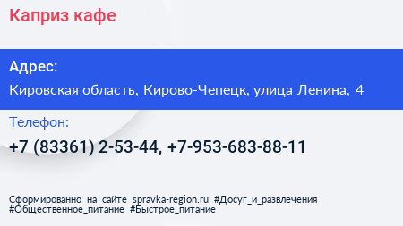 Каприз, кафе по адресу Кировская область, Кирово-Чепецк, улица Ленина, 4 в дальнейшем Организация, размещена в следующих категориях: