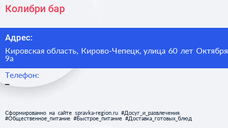 Колибри, бар по адресу Кировская область, Кирово-Чепецк, улица 60 лет Октября, 9а в дальнейшем Организация, размещена в следующих категориях:
