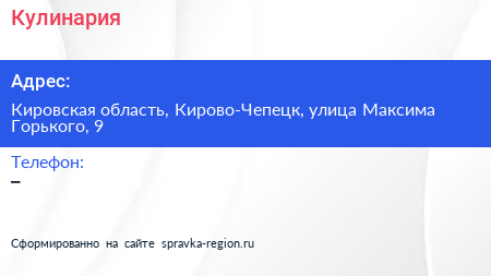 Кулинария по адресу Кировская область, Кирово-Чепецк, улица Максима Горького, 9 в дальнейшем Организация, размещена в следующих категориях: