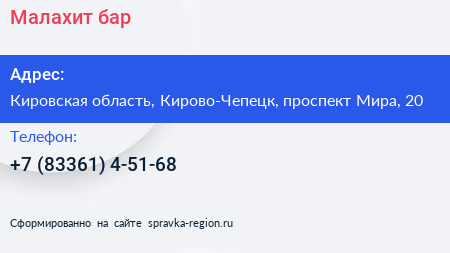 Малахит, бар по адресу Кировская область, Кирово-Чепецк, проспект Мира, 20 в дальнейшем Организация, размещена в следующих категориях: