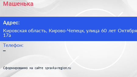 Машенька по адресу Кировская область, Кирово-Чепецк, улица 60 лет Октября, 17а в дальнейшем Организация, размещена в следующих категориях: