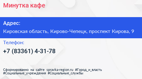 Минутка, кафе по адресу Кировская область, Кирово-Чепецк, проспект Кирова, 9 в дальнейшем Организация, размещена в следующих категориях: