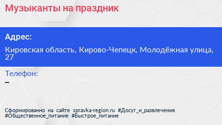 Музыканты на праздник по адресу Кировская область, Кирово-Чепецк, Молодёжная улица, 27 в дальнейшем Организация, размещена в следующих категориях: