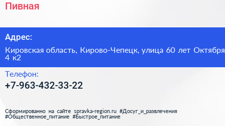 Пивная по адресу Кировская область, Кирово-Чепецк, улица 60 лет Октября, 4 к2 в дальнейшем Организация, размещена в следующих категориях:
