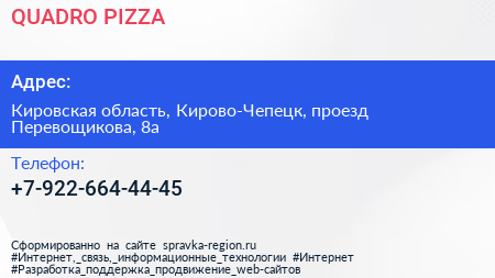 QUADRO PIZZA по адресу Кировская область, Кирово-Чепецк, проезд Перевощикова, 8а в дальнейшем Организация, размещена в следующих категориях: