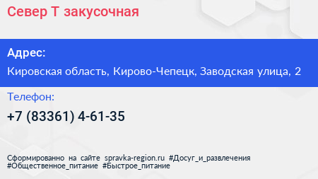 Север-Т, закусочная по адресу Кировская область, Кирово-Чепецк, Заводская улица, 2 в дальнейшем Организация, размещена в следующих категориях: