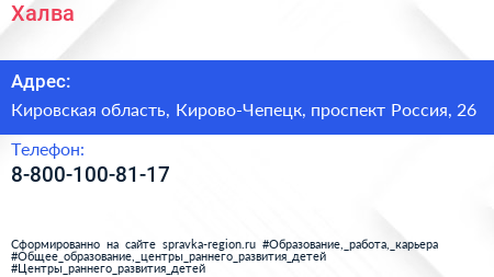 Халва по адресу Кировская область, Кирово-Чепецк, проспект Россия, 26 в дальнейшем Организация, размещена в следующих категориях:
