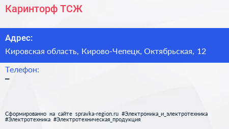 Каринторф, ТСЖ по адресу Кировская область, Кирово-Чепецк, Октябрьская, 12 в дальнейшем Организация, размещена в следующих категориях: