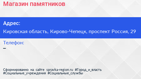 Магазин памятников по адресу Кировская область, Кирово-Чепецк, проспект Россия, 29 в дальнейшем Организация, размещена в следующих категориях: