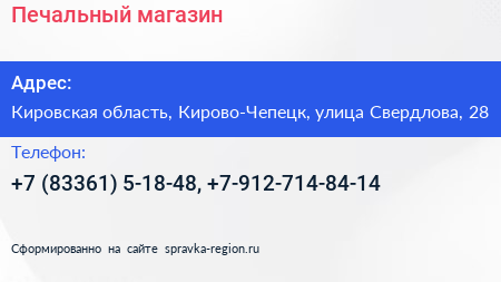 Печальный магазин по адресу Кировская область, Кирово-Чепецк, улица Свердлова, 28 в дальнейшем Организация, размещена в следующих категориях: