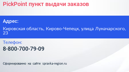 PickPoint, пункт выдачи заказов по адресу Кировская область, Кирово-Чепецк, улица Луначарского, 23 в дальнейшем Организация, размещена в следующих категориях: