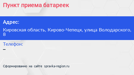 Пункт приема батареек по адресу Кировская область, Кирово-Чепецк, улица Володарского, 8 в дальнейшем Организация, размещена в следующих категориях: