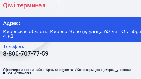 Qiwi, терминал по адресу Кировская область, Кирово-Чепецк, улица 60 лет Октября, 4 к2 в дальнейшем Организация, размещена в следующих категориях: