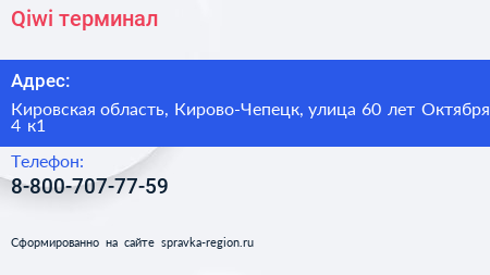 Qiwi, терминал по адресу Кировская область, Кирово-Чепецк, улица 60 лет Октября, 4 к1 в дальнейшем Организация, размещена в следующих категориях: