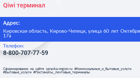 Qiwi, терминал по адресу Кировская область, Кирово-Чепецк, улица 60 лет Октября, 17а в дальнейшем Организация, размещена в следующих категориях: